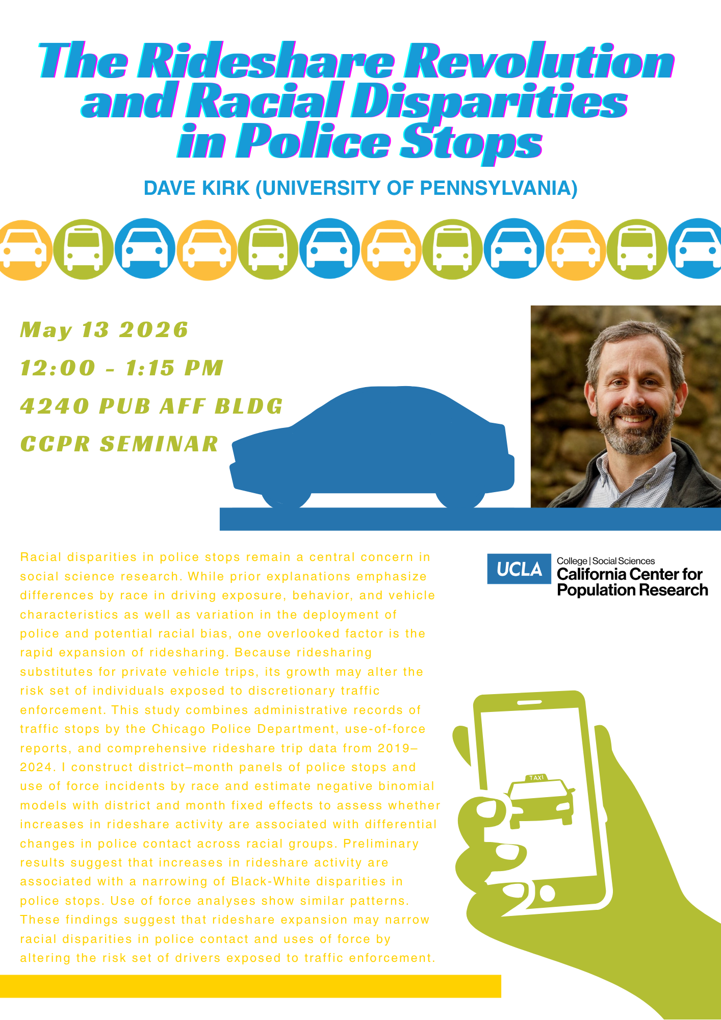 Abstract: Racial disparities in police stops remain a central concern in social science research. While prior explanations emphasize differences by race in driving exposure, behavior, and vehicle characteristics as well as variation in the deployment of police and potential racial bias, one overlooked factor is the rapid expansion of ridesharing. Because ridesharing substitutes for private vehicle trips, its growth may alter the risk set of individuals exposed to discretionary traffic enforcement. This study combines administrative records of traffic stops by the Chicago Police Department, use-of-force reports, and comprehensive rideshare trip data from 2019–2024. I construct district–month panels of police stops and use of force incidents by race and estimate negative binomial models with district and month fixed effects to assess whether increases in rideshare activity are associated with differential changes in police contact across racial groups. Preliminary results suggest that increases in rideshare activity are associated with a narrowing of Black-White disparities in police stops. Use of force analyses show similar patterns. These findings suggest that rideshare expansion may narrow racial disparities in police contact and uses of force by altering the risk set of drivers exposed to traffic enforcement.
