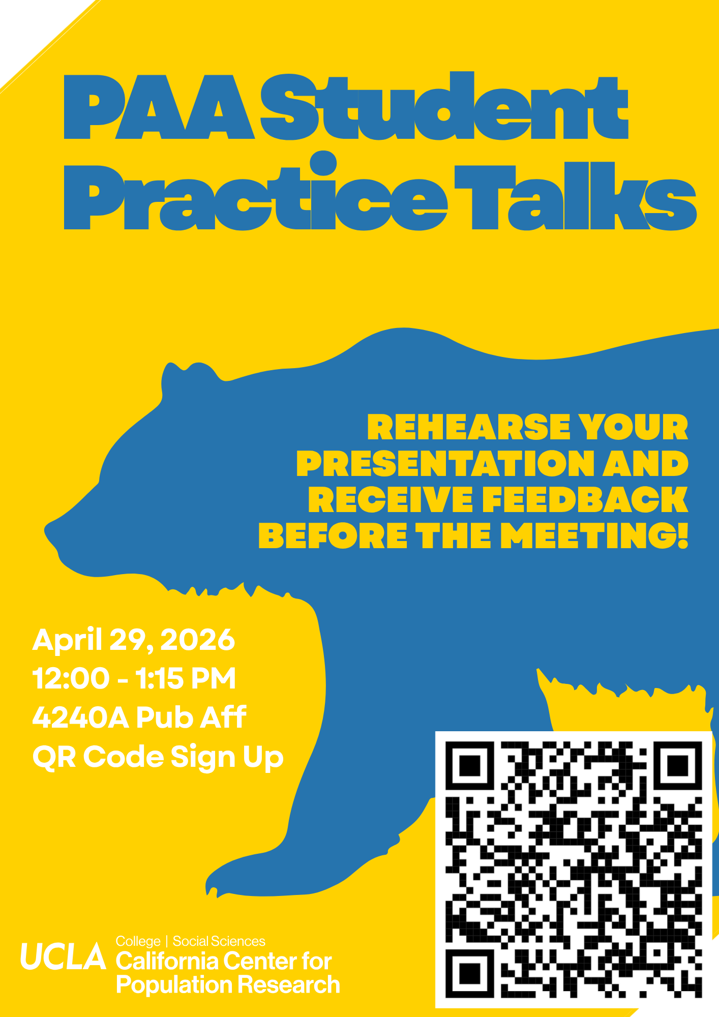 If you are presenting at PAA and would like to give a practice talk at CCPR, please complete the PAA 2026 Practice Talks form by Friday, April 3. The session will be held on Wednesday, April 29, from 12:00–1:15 PM. This will be a great opportunity to rehearse your presentation and receive feedback before the meeting.